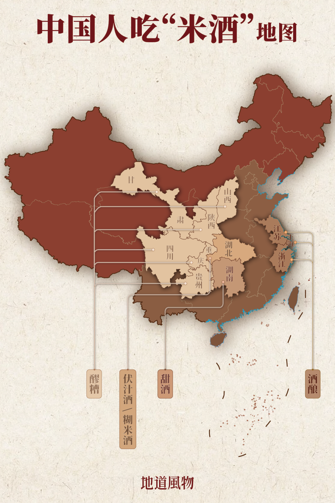 尽管各地做法大体统一,然而物产、气候不同,仍然拉开了各地米酒在味道上的细致差别,由此造成了“一地一名”的情形。比如,北方米酒多使用圆糯米酿制,相较于南方使用长糯米而成的米酒更加清甜。而制作与饮用的时令差异,则带来了米酒在地区间的最大差异。