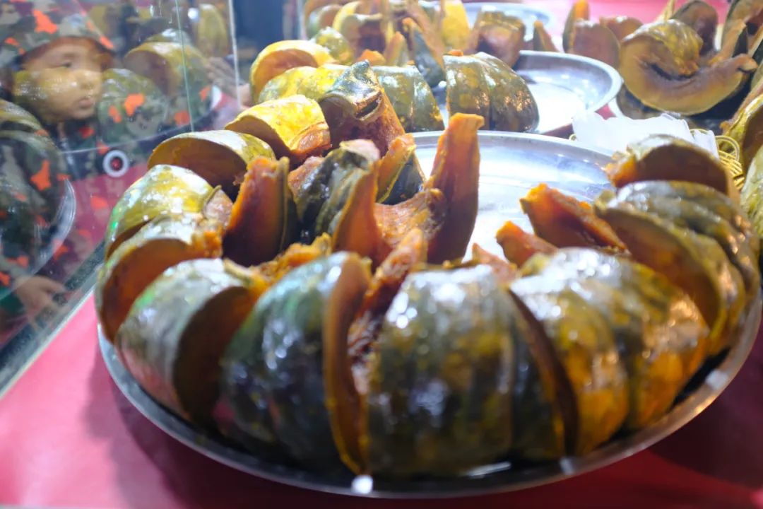 新疆日照充足、昼夜温差大,种出来的南瓜自然个头大、糖分也高,用来烤制,能将瓜果的香气和甜度激发到极致。把南瓜洗净掏空之后,有的会塞入各式各样的干果,有的则只刷上一层薄薄的蜂蜜,烤出来的南瓜松软可口,兼具了南瓜的馥郁、炭火的焦香和蜜糖的甜腻。