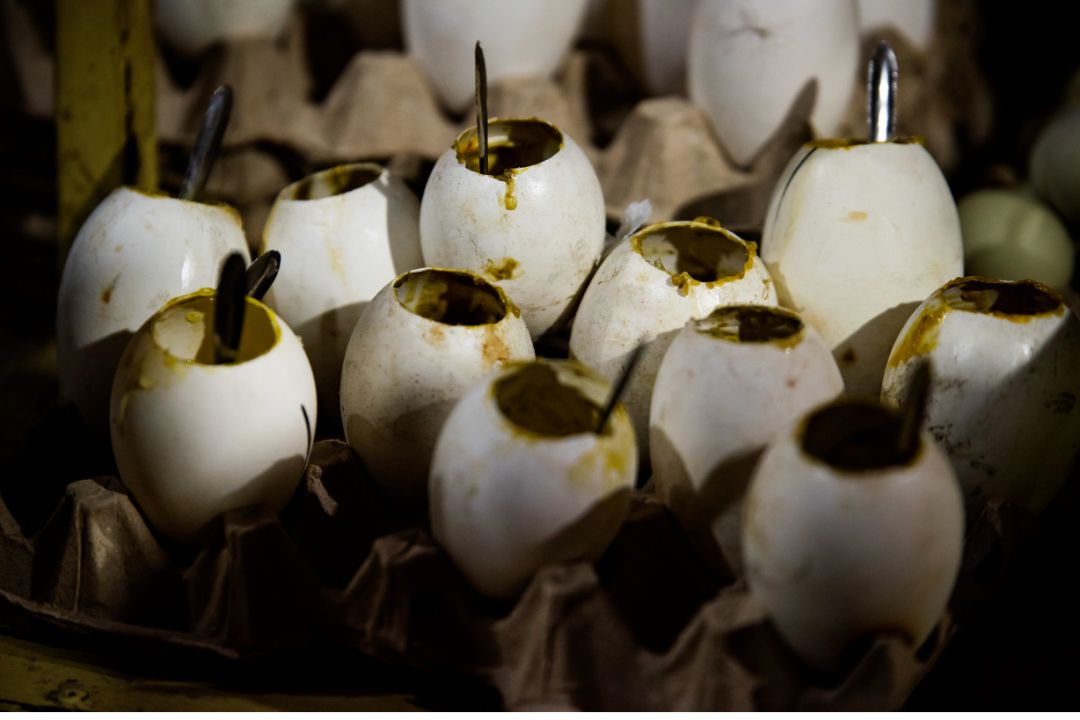 而到现在,烤蛋的创意也在不断更新。进阶版的豪华吃法,把硕大的鹅蛋顶部撬开,倒出蛋液,之留下蛋黄与鸡蛋黄、鸽子蛋黄混合,再倒入蜂蜜,点缀上养生青年热衷的藏红花,架起来边搅拌边烤,号称是“三蛋一星”。当然,如果你愿意,鹌鹑蛋和鸭蛋也想加入其中,那就是“五蛋一星”啦。