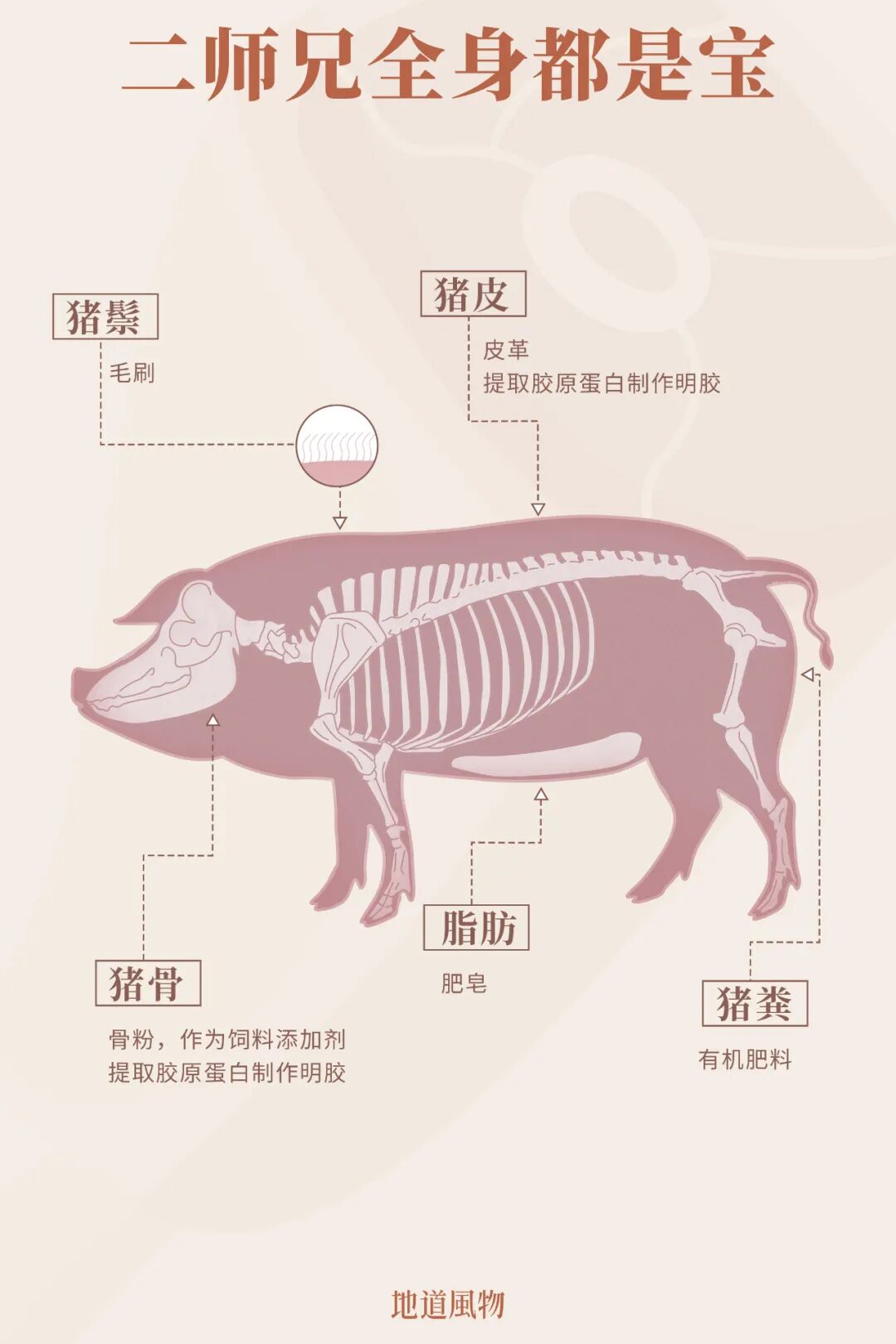 而到了现代,随着工业水平的进步,猪皮经鞣制后可以制成皮革;猪骨磨成的骨粉用作饲料中补钙与补磷的添加剂;猪油经过化工处理精炼为肥皂;从猪骨与猪皮中提取的胶原蛋白又是琼脂的重要原料。面对如此多的功用,我们说一句“猪的全身都是宝”真是毫不为过。就连猪的名字都可以拿来骂人