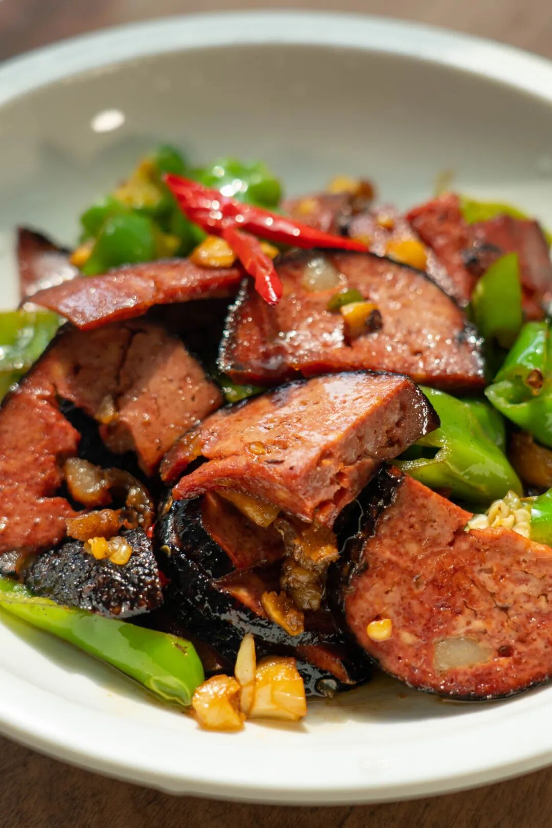 辣椒炒猪血丸子。