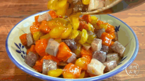 潮汕甜点“糕烧番薯芋”,金黄色的番薯块配上白色的芋头,好像“金砖银砖”,看起来就特别奢华。“糕烧”这种烹饪方法,最讲究的就是香滑浓稠的口感,水分不能多,糖浆必须足,一斤番薯芋头就要用一斤糖来熬煮,加上一勺猪油,还会有特别的奶香味。潮汕筵席讲究“头尾甜”,第一道菜或是最后一道菜总是离不开滋味甜、意头好的番薯芋。