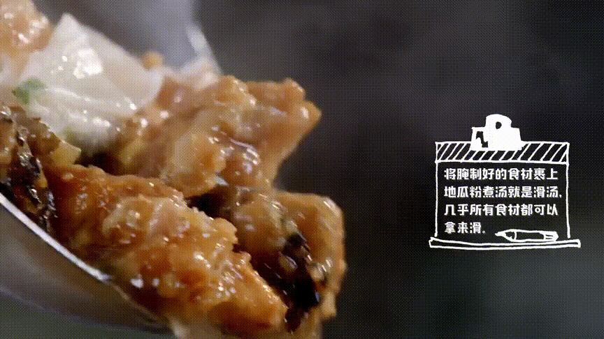 滑粉汤,一点点地瓜粉助阵就可以“滑”一切:滑海蛎、滑五花肉、滑肥牛、滑黄花鱼、滑马鲛、滑带鱼,不管滑什么,都是一样的鲜、软、弹,这都要感谢地瓜粉锁住了食材的好滋味。