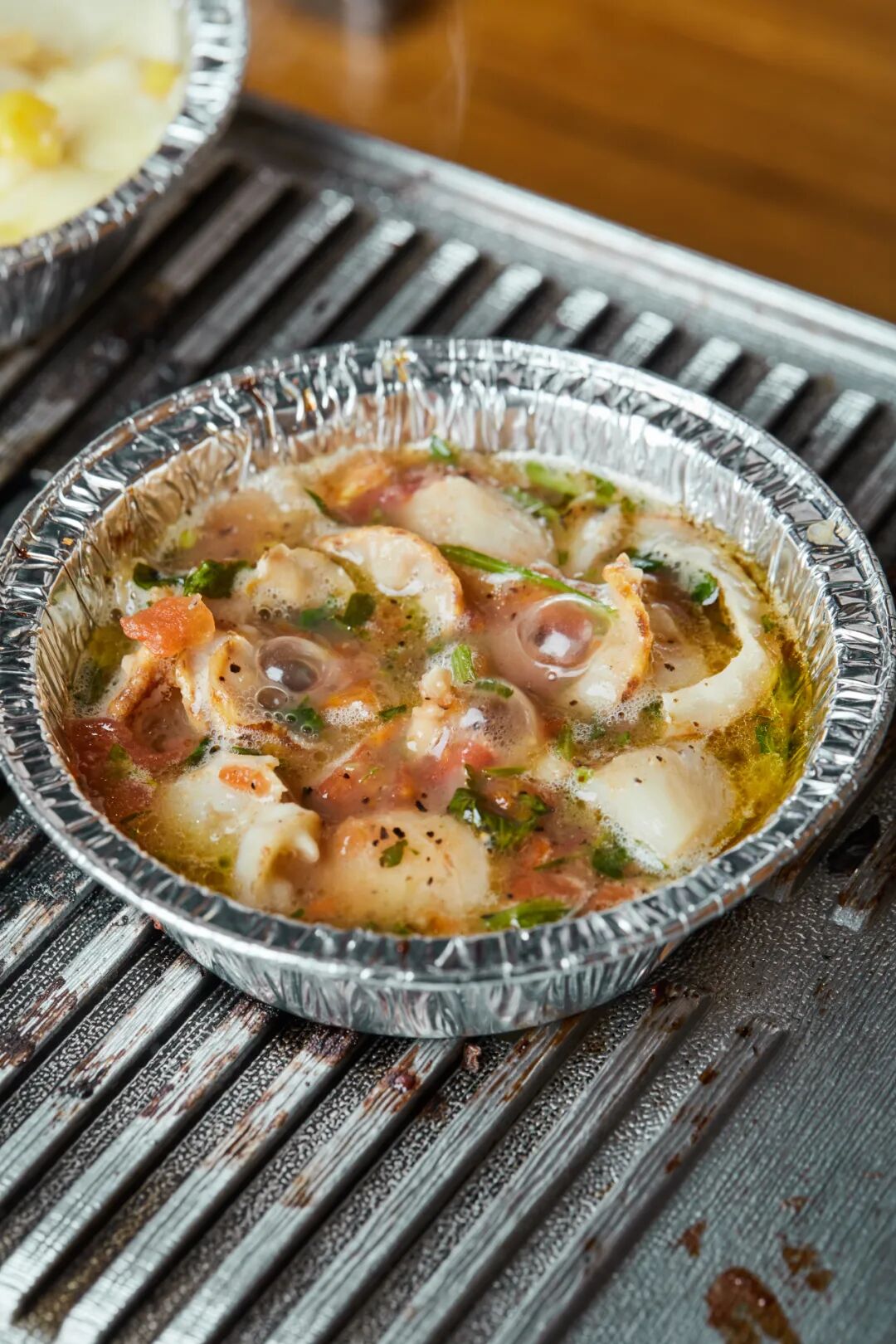 此粥要用事先蒸好的糯米,和鲜虾、鱿鱼、肉片一齐放入猪骨汤中翻煮。待糯米入味,即刻捞出,加入菇丁、鱼片、鸡丝等生料,猛火继续煮沸,吃时撒上蒜珠、香菜,米粒嚼之韧弹,粥汤饮之鲜爽。