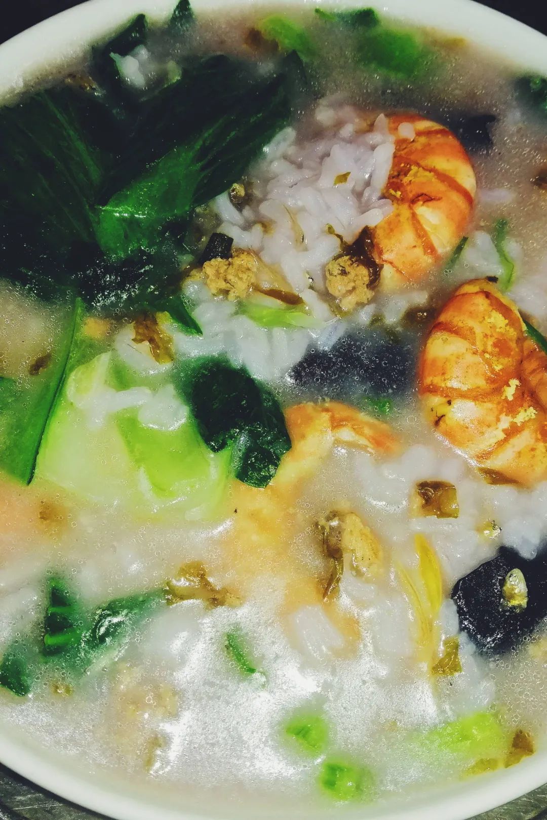 虽然名为“菜粥”,里面肉类和海鲜却一样不少,菜可以是芥菜,也可以是芹菜,还可以是酸菜,各家大同小异,丰俭由人。蒜末菌丁看似细碎,也是没有味精年代的呈鲜秘籍。