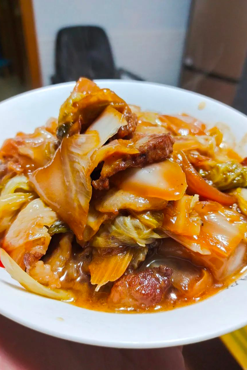 猪肉炖粉条是东北名菜,其实“白菜猪肉炖粉条”才是更常见的形态。白菜清清淡淡的,可是特别能吸油水,还容易入味,粉条保证了汤汁的浓厚,搭配大块的五花肉,这样肥而不腻,每一口都不寡淡。