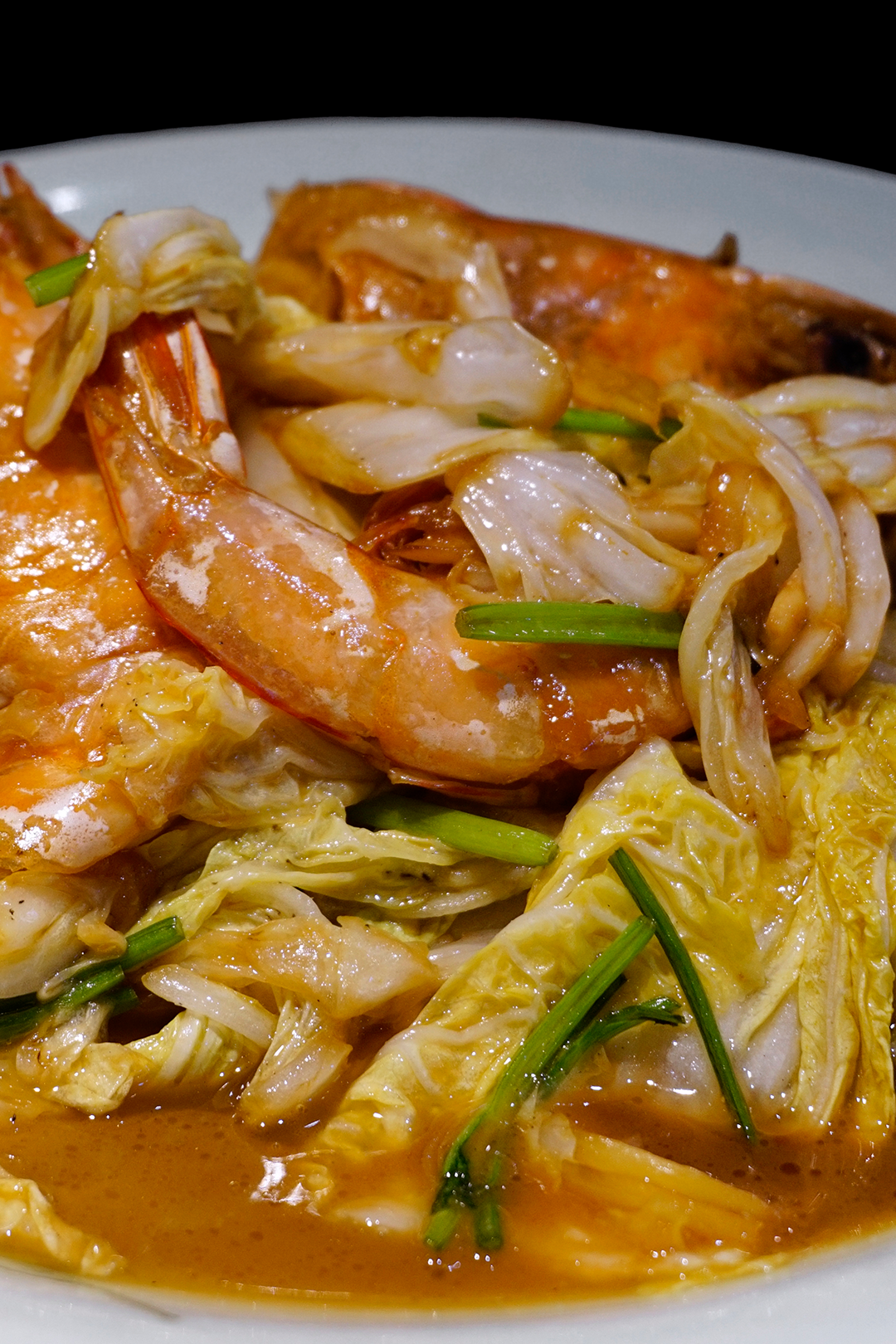 到了胶东,白菜要与对虾同炒才对味。鲜香肉紧的青岛对虾,虾膏丰满,稍稍煸炒就能释放出油脂丰富的鲜味,又尽数融进白菜之中。闻一闻这炒出来的成品吧,白菜的清甜与大虾的浓香交织在一起,鲜,香,浓,不是一般的下饭!