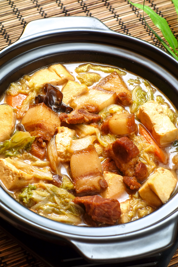 山东淄博,冬天必吃酥锅。汁水丰富的大白菜是必不可少的,它不仅是锅中水分的主要来源,也为整道菜提供了鲜甜的底味。锅底放藕片,免得粘锅,然后铺上大白菜,接下来就是厚厚的一层猪蹄排骨五花肉外加鸡鸭鱼,海带冻豆腐也不可或缺。食材满满当当地放进锅里,早就冒了尖,可是不用担心,小火炖上几个小时,白菜出了汁,而肉已经熟至酥烂。趁热吃,是痛快吃肉的豪迈;放凉了吃,汤汁结成冻,就更爽滑醇香。