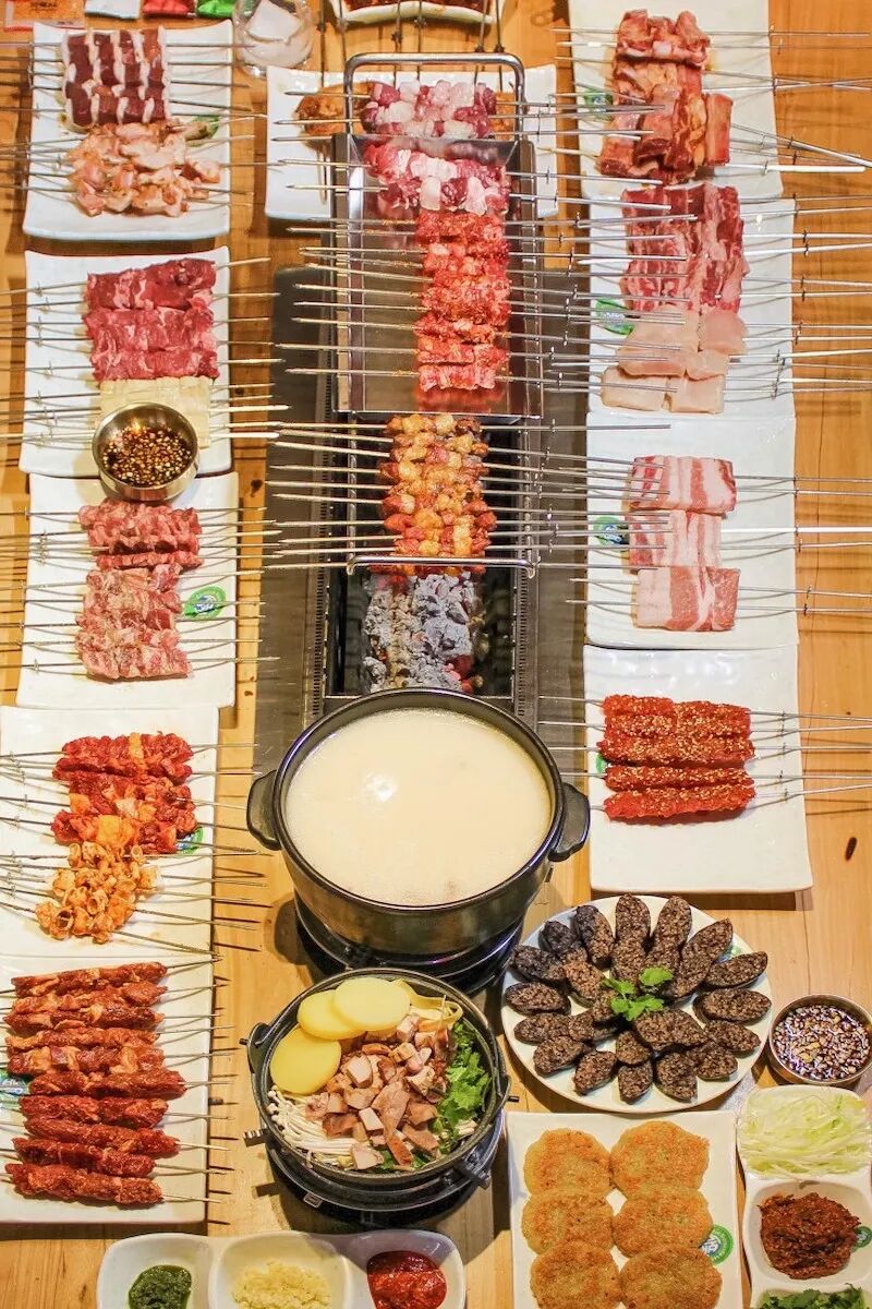 但最好吃的吃法还是要去烧烤店,延边烧烤的特色是桌子上放炭火,自己手动烤,碳炉上一边是牛肉串,一边是啤酒牛杂锅,旁边还有一盘特色拌菜牛板筋,是延边版全牛宴。