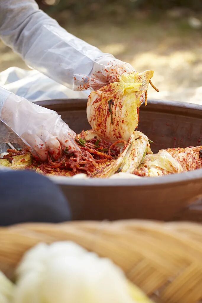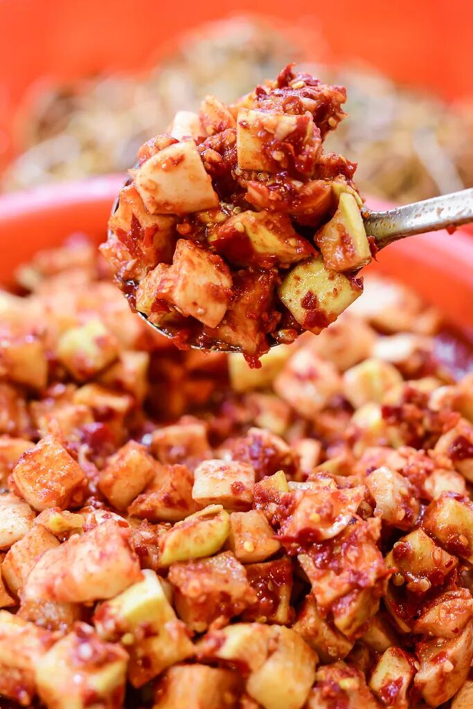 比如做泡菜的泡菜酱,泡菜酱一般会在辣椒粉里加入本地的苹果梨、虾酱、蜂蜜、糯米粉来调味,做出来的泡菜鲜咸酸甜。泡菜里的辣白菜,还可以用来做辣炒五花肉,泡白萝卜可以做汤,这是辣椒的第三次变身。