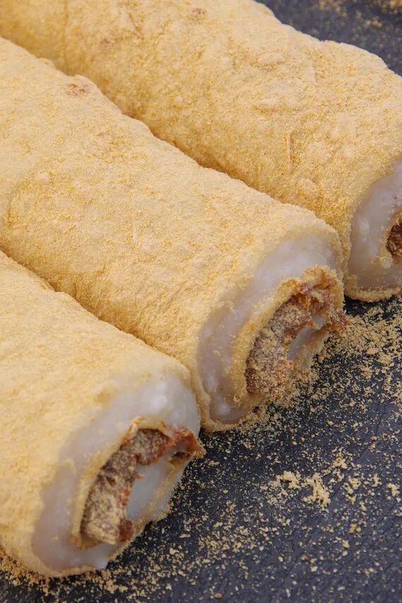 糯米也是延边美食中不可缺少的一部分,最熟悉的是打糕,刚打出来的年糕热乎乎,蘸上黄豆面软糯香甜。如果重大节日,如过年、周岁宴等,年糕会被做成色彩缤纷,包着豆馅的形态,更显喜庆和热闹。