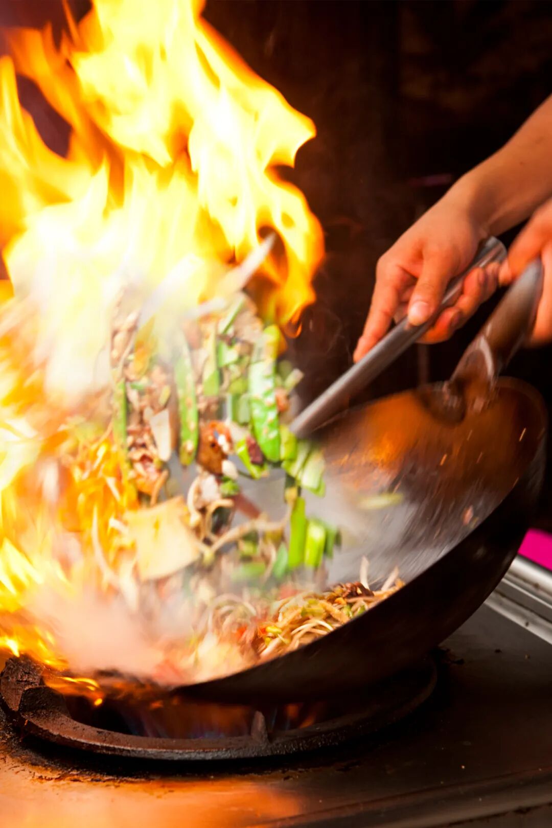大翻勺,在家别轻易尝试,菜掉地上不好捡。