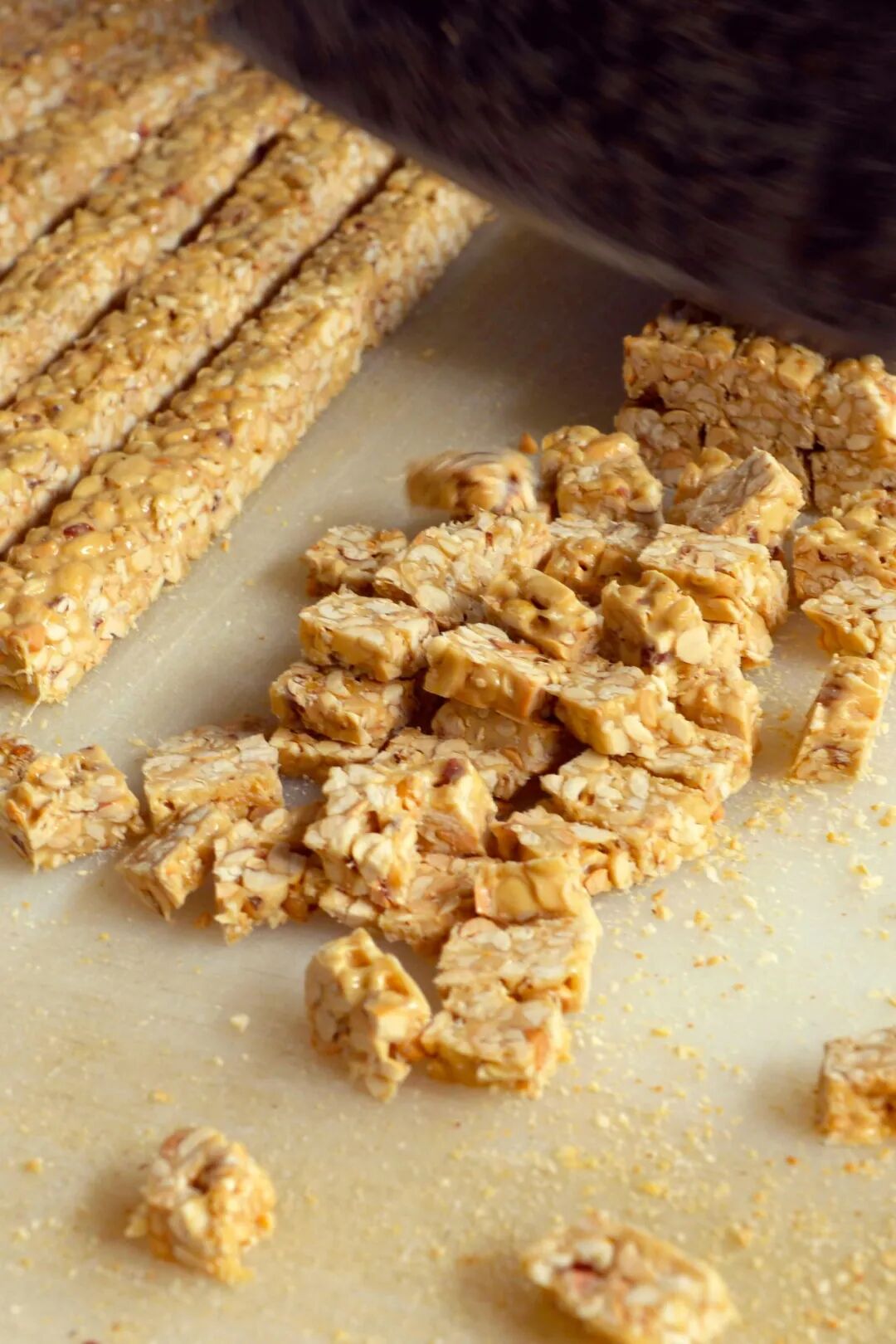 合肥,“陶永祥”的老师傅们正在切制成品花生糖。