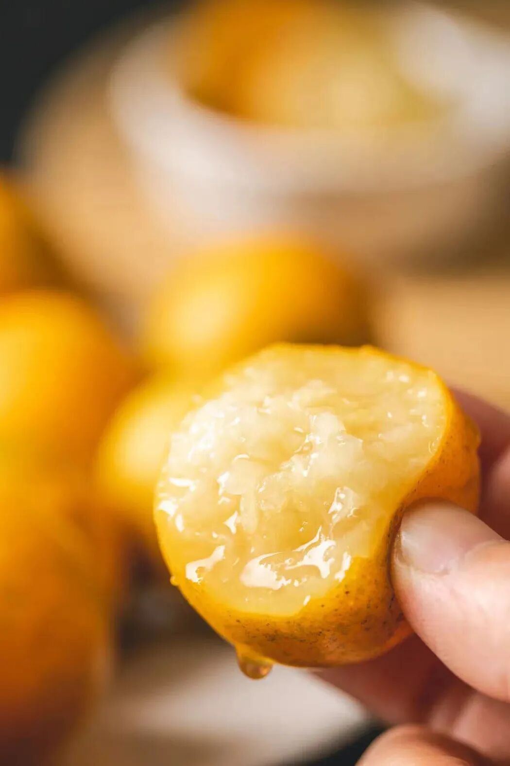 融安金桔的进阶之路,一共分为4部分,在第一代实生金桔和第二代矮化嫁接油皮金桔这两个阶段,金桔偏酸,皮偏厚,所以除了直接吃,金桔通常被用来做成蜜饯、或是潮汕人泡水用的咸金桔。