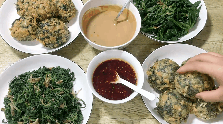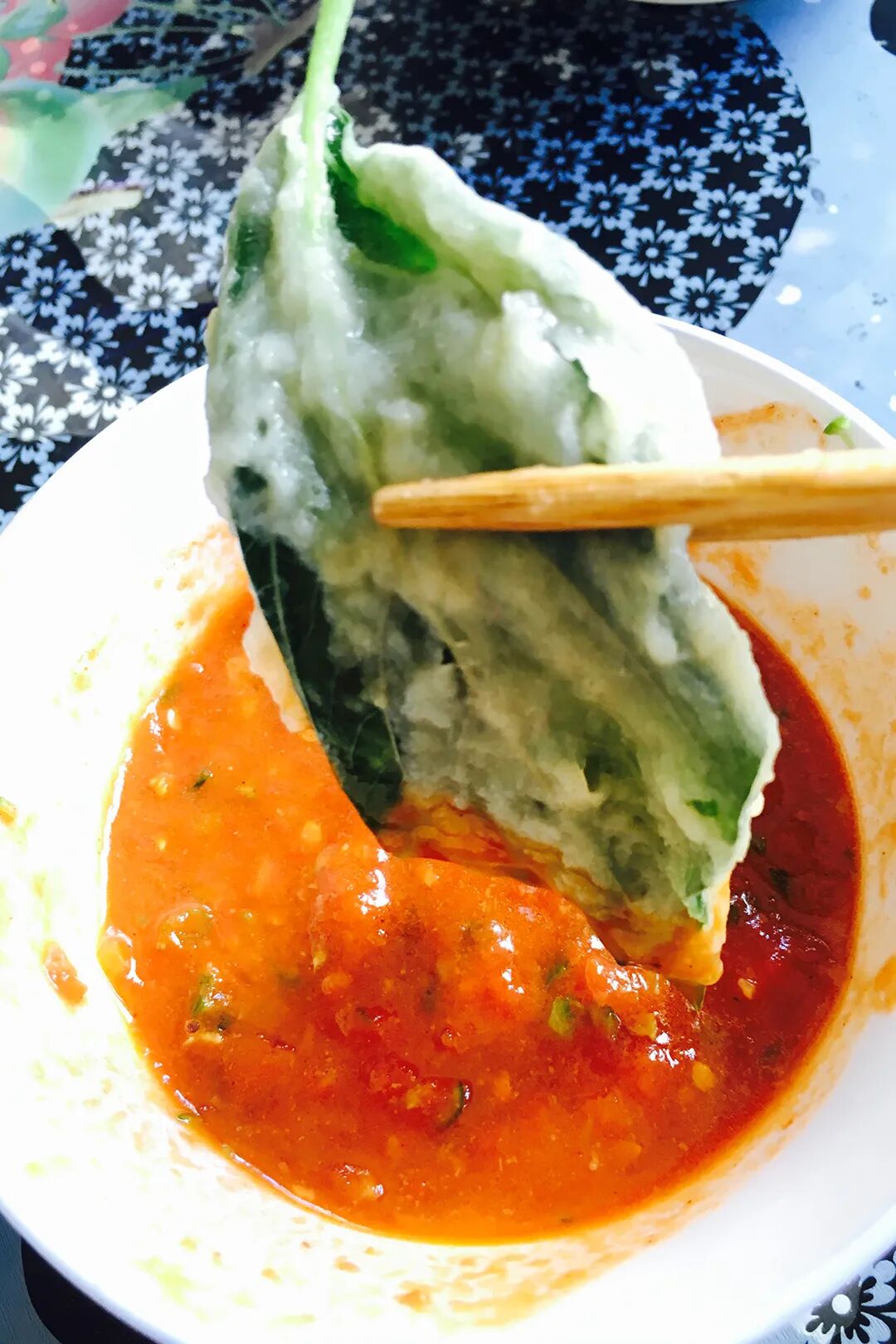 提着叶柄,在面糊中轻轻拖,就能挂上均匀的面糊,放锅里清煮捞出,蘸上调料,就是一道既“面”又“菜”的美食。面与菜的融合,尽显功力。面不能糊不能稀,才能与菜抱地结结实实,否则面菜分离,尽数败退。在这一点上,山西人做得扎实,三听白面,一听红面,一听豆面,就能调和出柔韧的面糊,牢牢匹配上玉谷叶的特征。