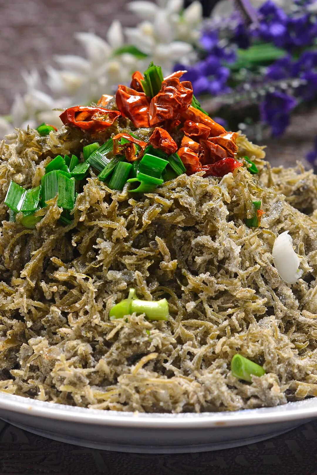 白蒿柔嫩,苜蓿清香,这两种野菜是拨烂子的天然助攻。有句话叫,“正月茵陈(白蒿的别名)二月蒿,三月割了当柴烧”,当“蒿团团”灰白色的嫩芽开始在春风中散发出特殊的香气,挖白蒿就成了正月山西家庭的团建活动。将白蒿挑出细小的草叶淘洗晾晒后,凉拌个豆腐、蒸个麦饭,再豪华点的做法是将拌上了油的白蒿与面粉搅拌,放在篦子上,大火一开,做成菜香浓郁的白蒿拨烂子。运城人喜欢用白芷、三奈、香沙、白蔻,搭配山西老陈醋、运城线椒,调出酱汁,组成一桌白蒿家宴。