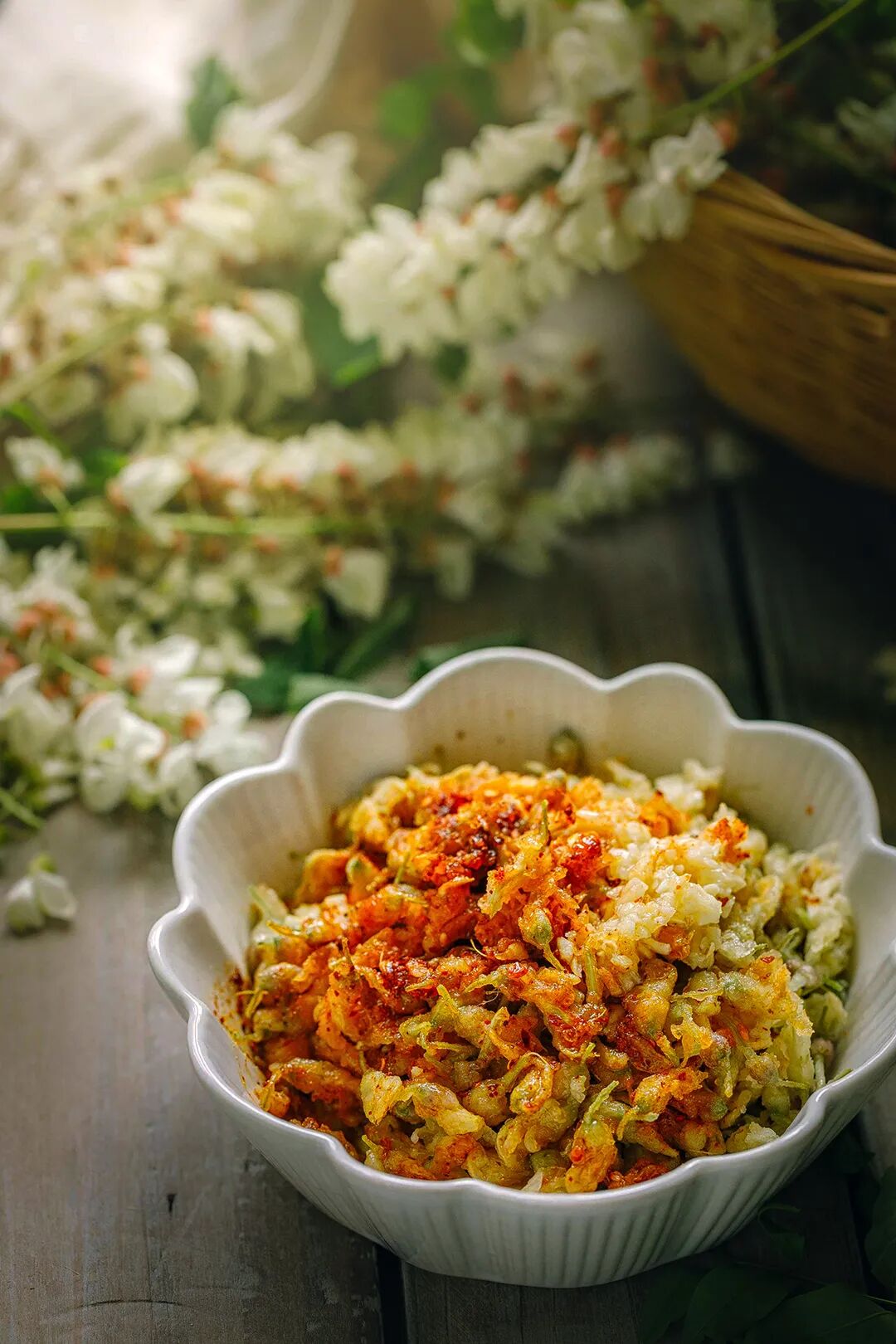 槐花满院飘香的时候,山西孩子抱着长竹竿,一摘就是一大袋子。边摘边吃,算是摘花人的福利,牙齿碾碎花瓣的刹那,感受花朵的香甜,是原生的芬芳;面花相伴,则有奇异的化学反应。忻州人将槐花洗净后拌面再蒸,原平人还会多一道焯水的步骤,去除槐花的皂苷气味。蒸好的拨烂子里,槐花的晶莹质感散发出淡淡的清香甘甜,一尝就能吃出淡淡的花香,融以蒜的烈香、香油的浓香,就能立刻沾染上“山西味儿”。