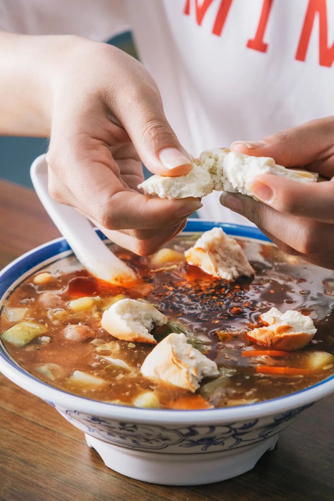 大碗浓汤上桌,颤颤巍巍不洒,一块热乎着的饦饦馍掰成块状,泡入碗中搅匀。等到一顿风卷残云,连馍带汤混杂着肉丸蔬菜吃下后,碗底不留剩汤,这才是西安肉丸糊辣汤应有的姿态,说明店家勾芡功底扎实,汤汁粘稠醇厚。老饕们一碗下肚,吃得干干净净,同样也心满意足。