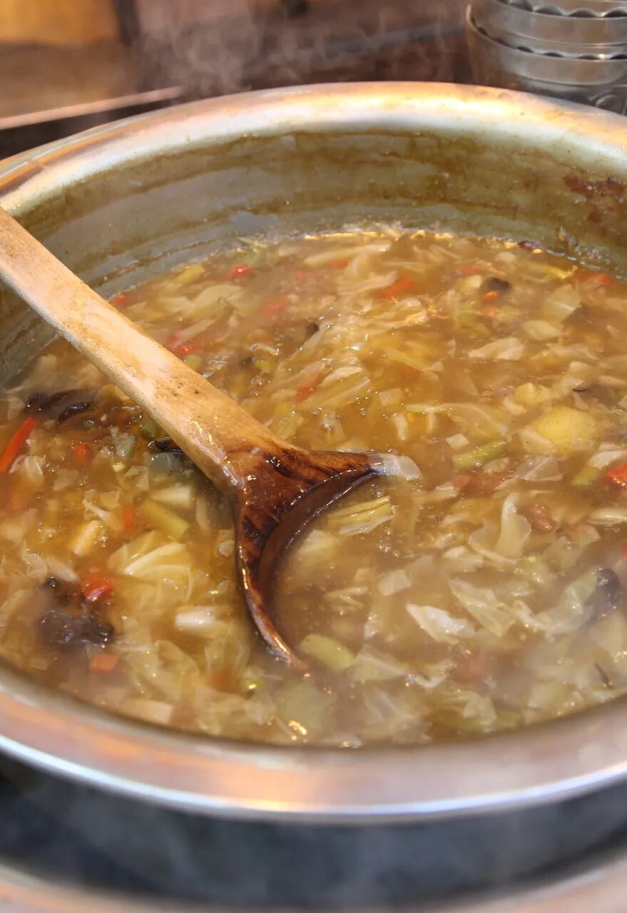 一锅由牛棒骨为主的浓汤,经由两个多小时熬煮而成,其间要先下蔬菜——必不可少的是土豆和莲花白,前者保证汤汁浑厚,后者则负责口感清甜,由此引申出的胡萝卜、西葫芦、豆角、菜花等等,都是用以在浑厚与清甜间保持平衡。