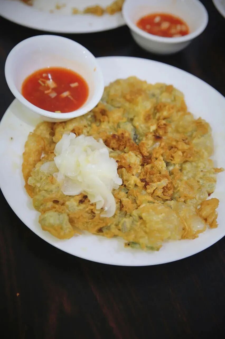 再说说蚵仔煎,在闽南和台湾地区属于无人不知的名小吃。是用加水后的番薯粉,包裹蚵仔(牡蛎)、韭菜、鸡蛋等食材后,煎制而成的饼状点心。