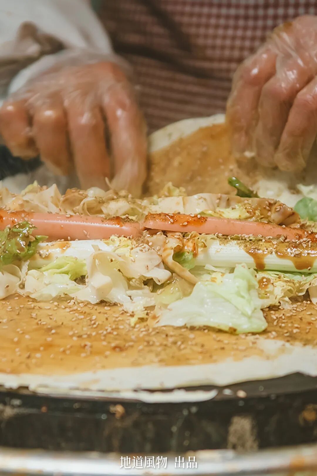 唯一不变的,就是无论是在哪里,煎饼之中一定要卷入更丰富、更美味的食材。大鱼大肉,蔬菜水果,世间万物,皆入其中。在这个意义上,煎饼也可以说是主食界中最为“内卷”的一员。
