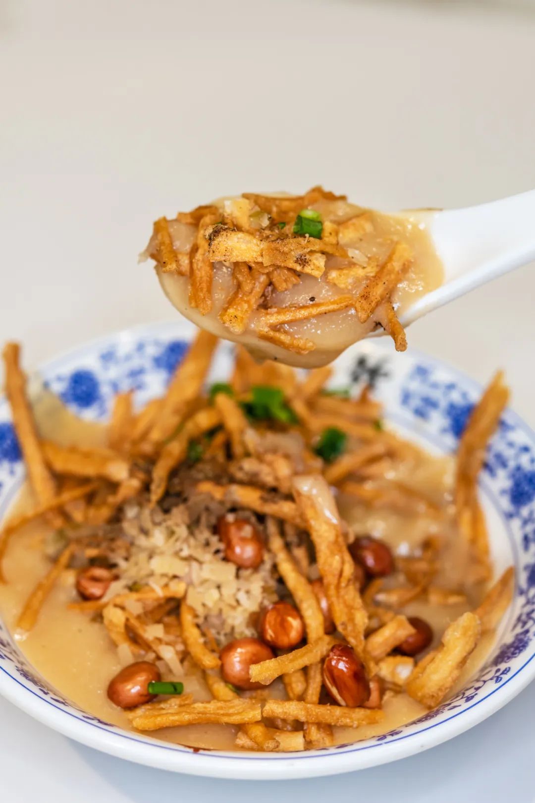 一碗油茶的灵魂是馓子,馓子要刚炸出来的,要细不要粗,细成丝丝为最佳,最好吃的时刻便是馓子表面被蒸汽泡得微湿,里面还维持着酥脆的口感,与柔软的米糊搭配,是四川人的奇思妙想。