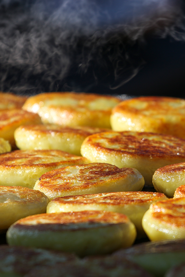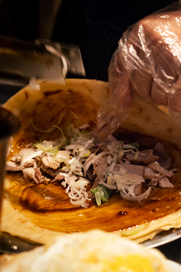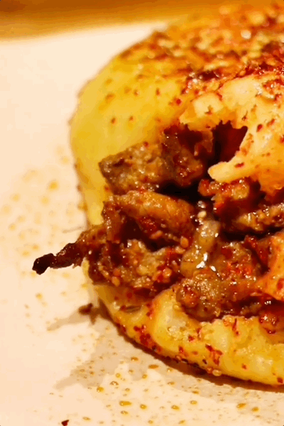 要吃筋道的,那必然是筋饼,吃的时候能明显感觉到拉扯中带着的弹性;嘎嘣脆的,那是玉米饼最下面一层的脆嘎巴,带一点焦糊,带一点脆硬;糯唧唧的,是大米饼,发酵过的米浆煎熟后空气感十足,又带着大米的晶莹剔透,像是小布丁一样;扎实的当然是发面饼,好的发面饼烙好后外面有一层面粉,毫无油腻感,外面煎得焦脆,里面是扎扎实实的面香。