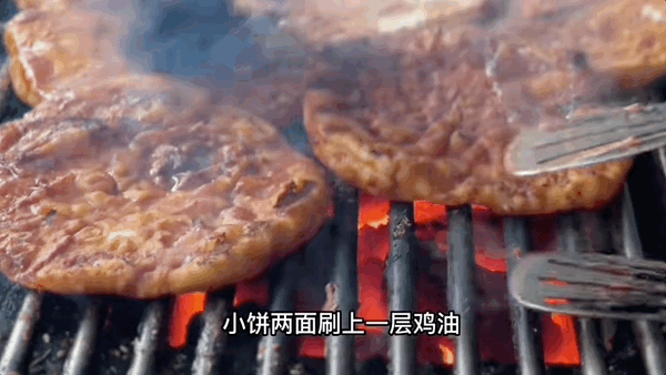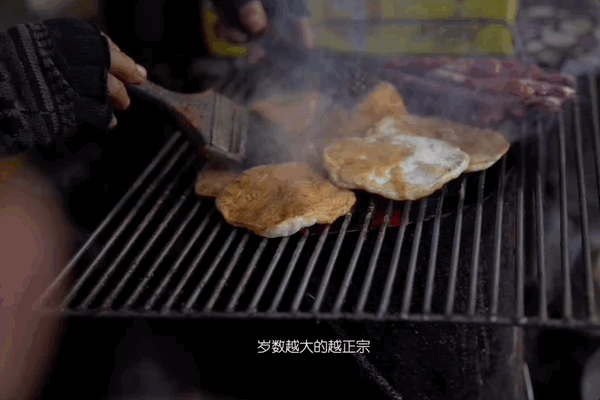 肇东小饼是一种炭烤的饼,小饼先在酱汁里浸泡过,再用炭火炙烤,不用电炉,饼上有着浓浓的炭火的香味儿,灵魂是刷在上面的鸡油、一大把葱花和老太太,鸡油自带肉荤味,即便是不再点别的串,也足够油香,冬日里的葱花带着冰渣子,是东北美食的冰火交集,而烤炉旁的老太太在一方天地里运筹帷幄,做出中国做具仪式感的烤饼。