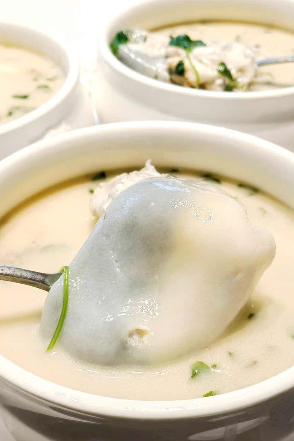 盘子里,琥珀色的汤汁浸着一条清蒸鱼,火腿和姜片红黄相间码在鱼身上。刚要落箸,服务员呈上一枚小勺,沿着鱼边轻轻“翘”下来一层鱼鳞,示意先品尝一下。我将信将疑含在嘴里,这鱼鳞却酥软可嚼,满满的胶质让口腔惊艳,那多刺而缠绵的鱼肉,反被盖过了。