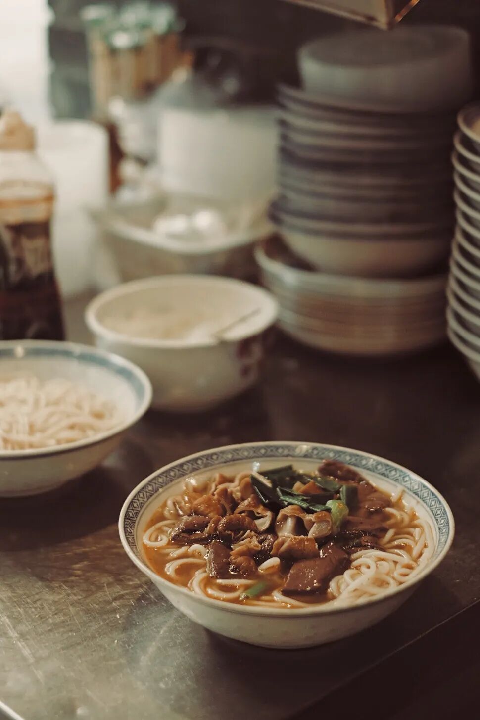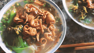 决定一碗猪脏粉成败的,还有汤底。温州粉店大多用猪骨来熬制浓汤,汤清油亮,一大勺浇入铺得满满当当的粉中,化开了肥肠的软糯、猪血的细嫩、米粉的顺滑。再放些咸香风味的豆瓣辣酱,无论是清晨还是深宵,在家乡还是他乡,这一碗猪脏粉总是温州人挥之不去的乡愁。