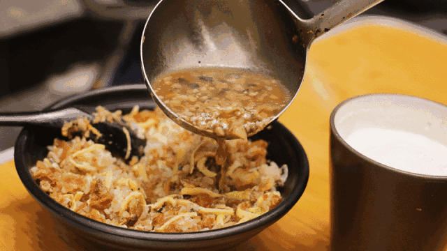 咸的用肉臊浇灌,在碗中撒入香酥的肉松、爽口的榨菜碎、细腻如脂的咸蛋黄,最讲究的是油条碎,必须是重炸过的“双泡油条”,吃起来才够酥脆,满口留香,再要上一碗甜豆浆,醇厚温润。咸的饭,甜的浆,堪称天作之合。