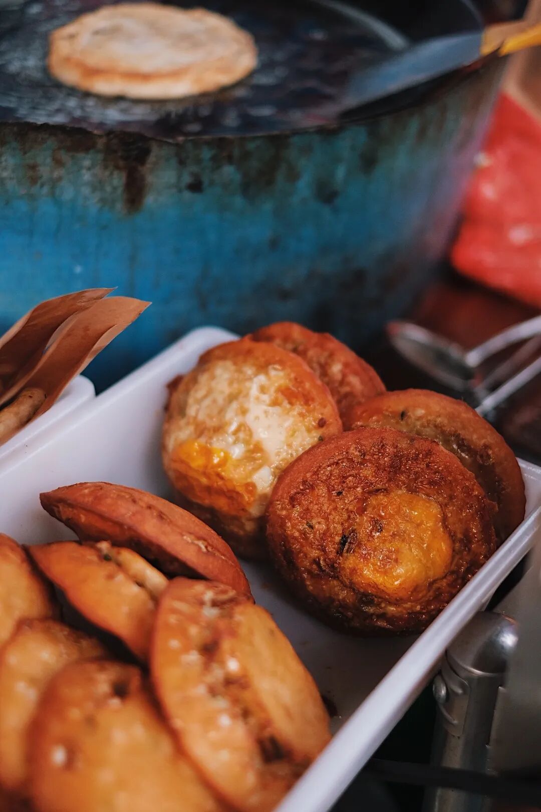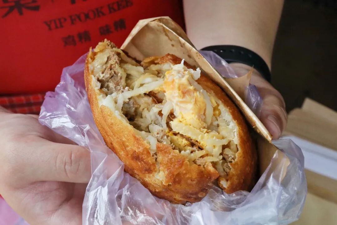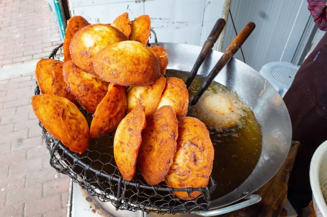 用圆扁型的长柄勺舀一勺大米与黄豆制成的米浆,铺上白萝卜丝和肉馅,再覆盖一层米浆,然后连同勺子一起沉入热油之中,眼见着米浆发酵鼓起,展现出诱人的金黄色。趁热咬下,外皮又香又脆,内里是鲜甜多汁的萝卜丝和满满当当的肉馅,给人以强烈的满足感。