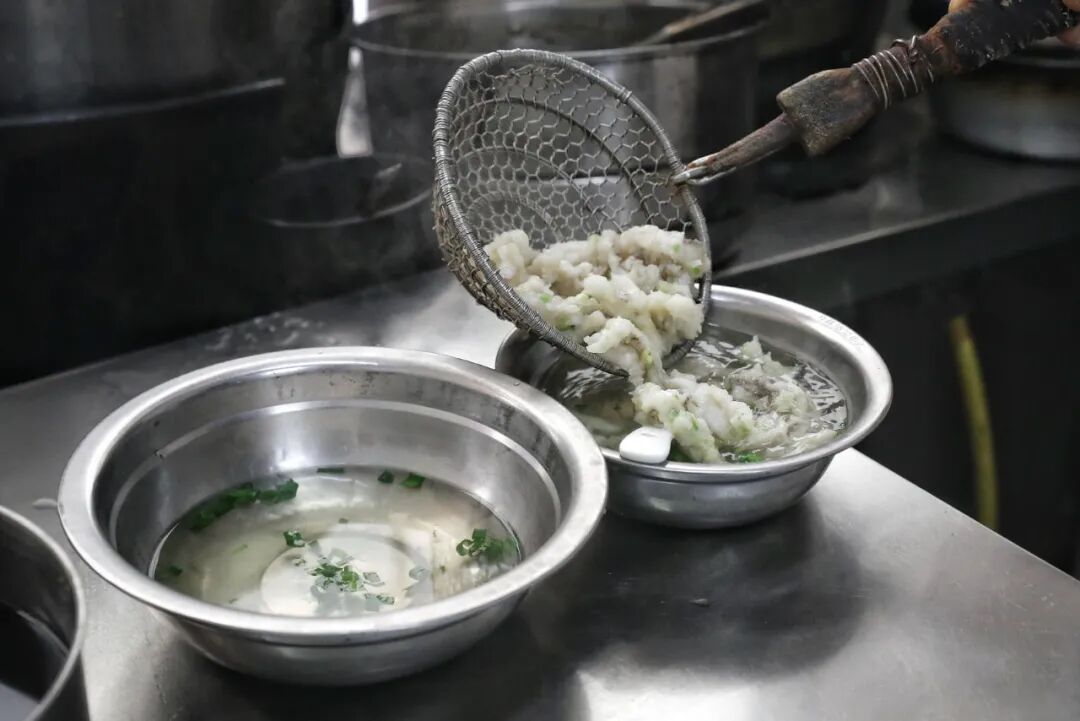 温州瘦肉羹,和福建的“福鼎肉片”大体相似,都制法朴素、用料实在,最适合当做午后加餐。只需把瘦肉和淀粉和匀,像火锅店里下虾滑似的,用细长的调羹划入沸水之中,调羹要抹一层油,手速要快。一套行云流水的操作后,肉丸变得顺滑细腻,可以放入紫菜、榨菜丝、虾皮、葱花、香菜……鲜香兼备,风味独特。