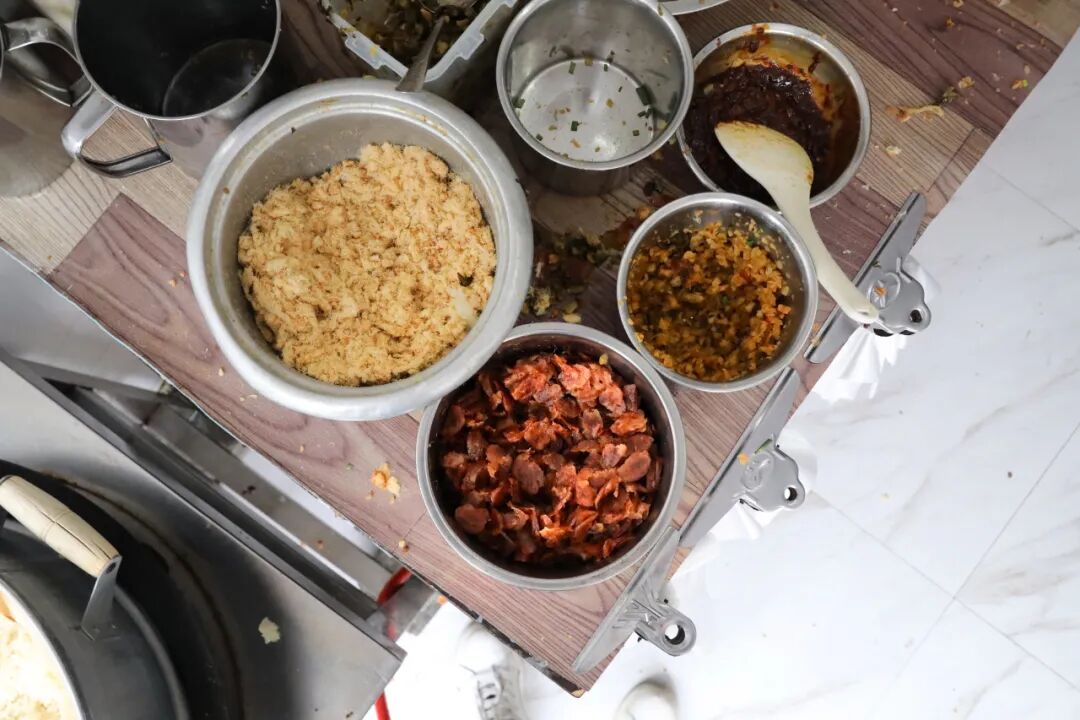 在当地,更为常见的叫法是“炊饭”——提前泡好的糯米白白胖胖,沥干水分,放入蒸屉中大火“炊”熟。这样炊出来的饭才够香够硬、粒粒分明,在凌晨三、四点的温州城里,唤醒每一个沉睡的居民。
