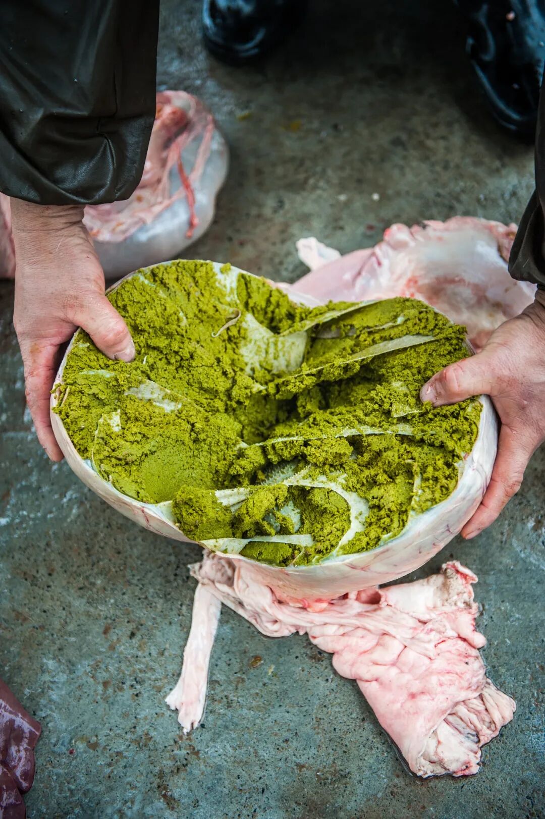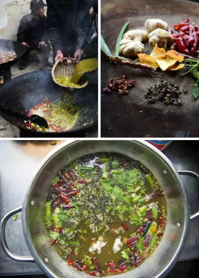 不过火锅的终极挑战,还在于食材。比如说,来自黔东南地区,又风行贵州、广西、云南交界处的牛瘪、羊瘪火锅。所谓的牛瘪、羊瘪,即是在牛羊胃肠中取出半消化的草,挤出的汤。不同的胃肠部位,取出的液体,颜色都略有不同,胃中草尚绿,小肠前段汁液丰富,至于更下端的地方,呃,你懂得。