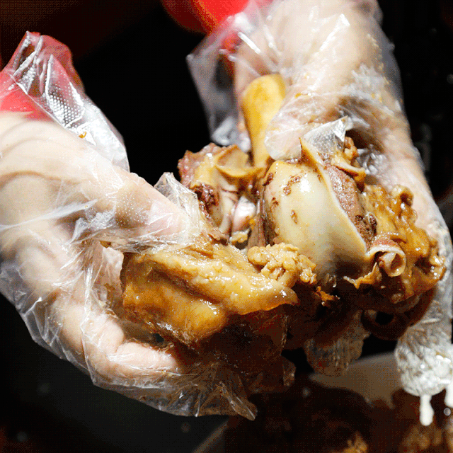 不同于广东靓汤不吃肉只喝汤的文雅,东北吃起大骨则充满了豪气:只啃肉,不喝汤。棒骨要经过足够时间的蒸煮,纳凉后放入自制料汤中卤制。吃的时候要先嗦骨髓再吃肉,最初的吃法是直接抱着大骨头棒,把表层骨髓嗦干净,然后用筷子慢慢挑剩余的骨髓,后来出现了文雅点的吃法,送你手套和吸管,用来手抓和吸食骨髓,虽文雅,但也少了不少乐趣。