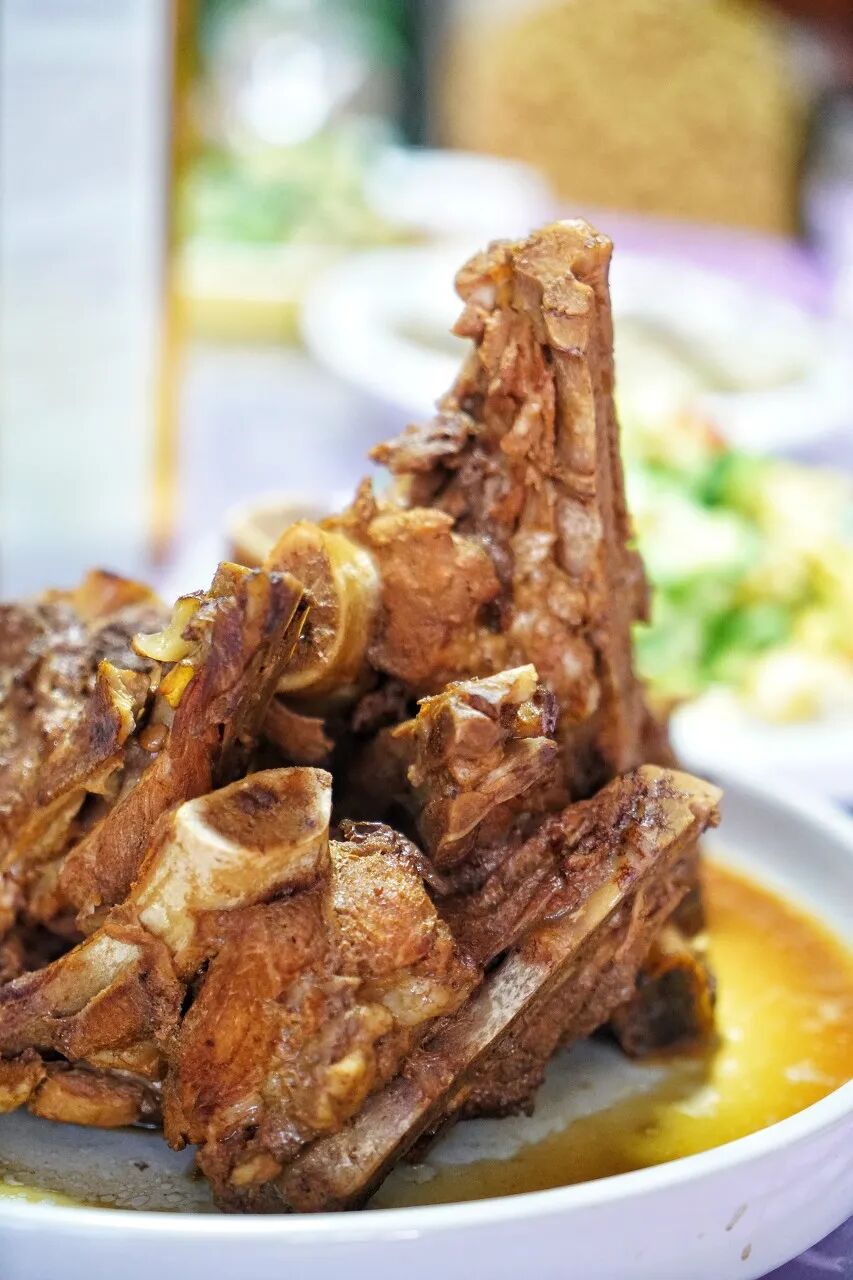 更大气的吃法,便是原汁原味的新疆烤羊排,烤羊排切小块,放进馕坑里焖烤,烤熟后撒上细盐和皮芽子,羊肉细嫩,把筷子扔到一边,直接上手!
