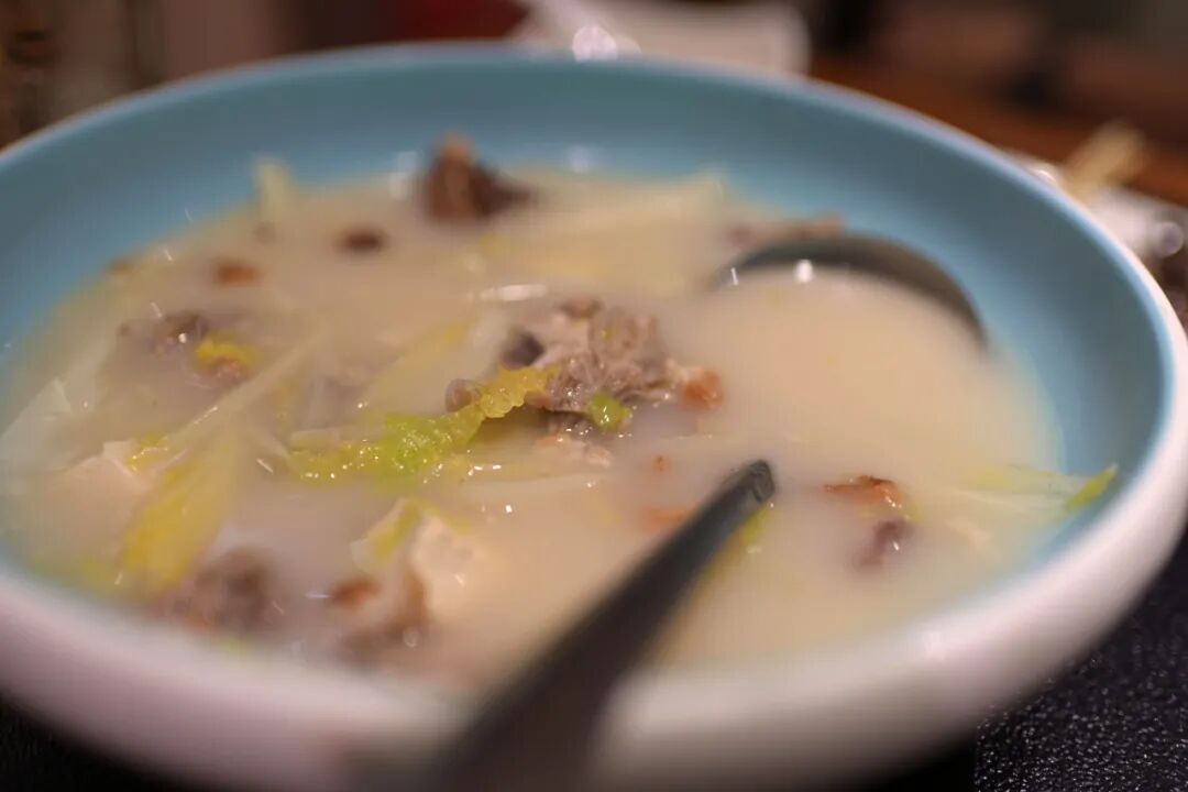 脊骨焯水后和土豆一起煮,调味用大酱和辣酱,再加上苏子籽和干白菜,汤色金黄,肉香浓郁,汤底味道鲜咸可口,土豆煮得绵软,大块脊骨肉虽然肉不多,但慢慢嗦起来却意外地有趣。