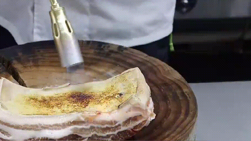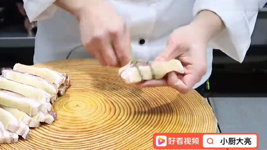 接下来处理猪皮:先用镊子拔掉猪皮粗毛,再通过烙铁或火枪去除细毛。为完美呈现那一层喷香弹牙的肉皮,脱毛这件事极为重要,必须一丝不苟地将所有毛孔处理干净。然后抡起大刀切肉,把带皮五花切成长条大片,每片厚约小半寸,长不到一拃,宽约两寸。