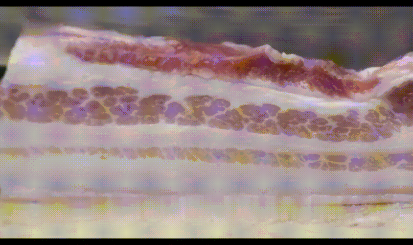 ▲ 用于制作把子肉的五花肉,截面就像“丹霞地貌”的纹理。图/纪录片《日出之食·济南》