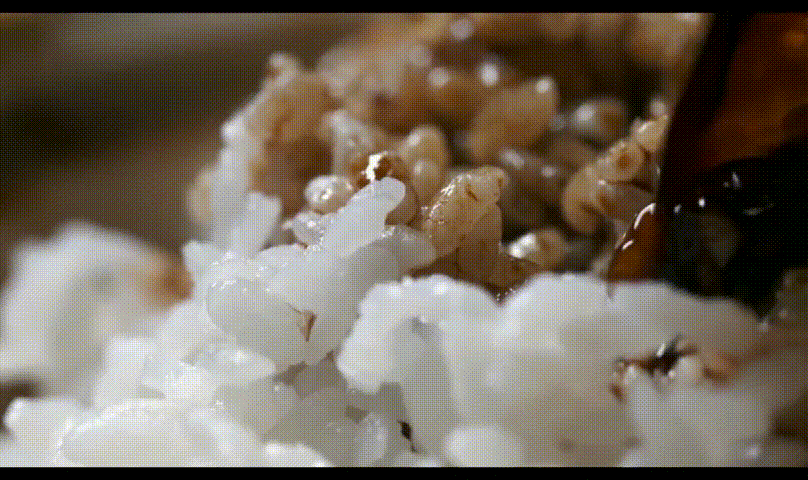 ▲ 把子肉捣碎与米饭充分融合,谁能抵挡得住?图/纪录片《日出之食·济南》截图