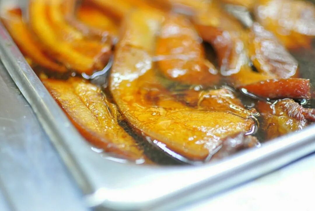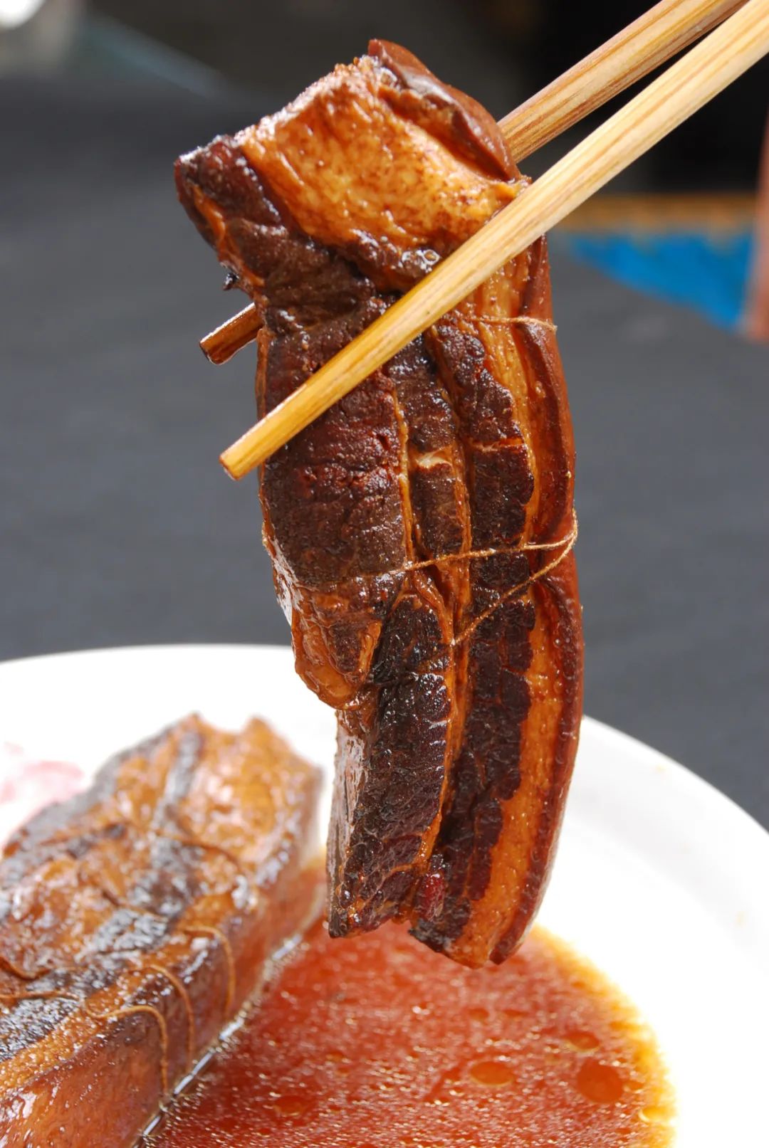 你看它,一片长条大肉,浓油赤酱、五花三层,泛着油亮的红光。一口咬下去,牙齿先触到微微发焦的猪皮,那是一种富有弹性的抵抗。再一大口,肥瘦相间的肉块缓缓释放出咸香的酱汁。