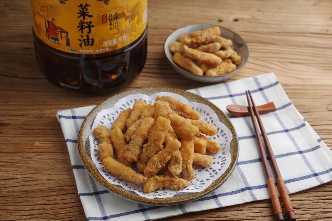 除了是辣菜伴侣,「外婆乡小榨菜籽油」也十分适合煎炸,比如做炸小酥肉、炸带鱼时,远远看去颜色金黄诱人,夹起一块放入口中,酥脆的声音在口中绽放,咬下一口香而不腻,没有油耗味,反倒还有一丝清爽。