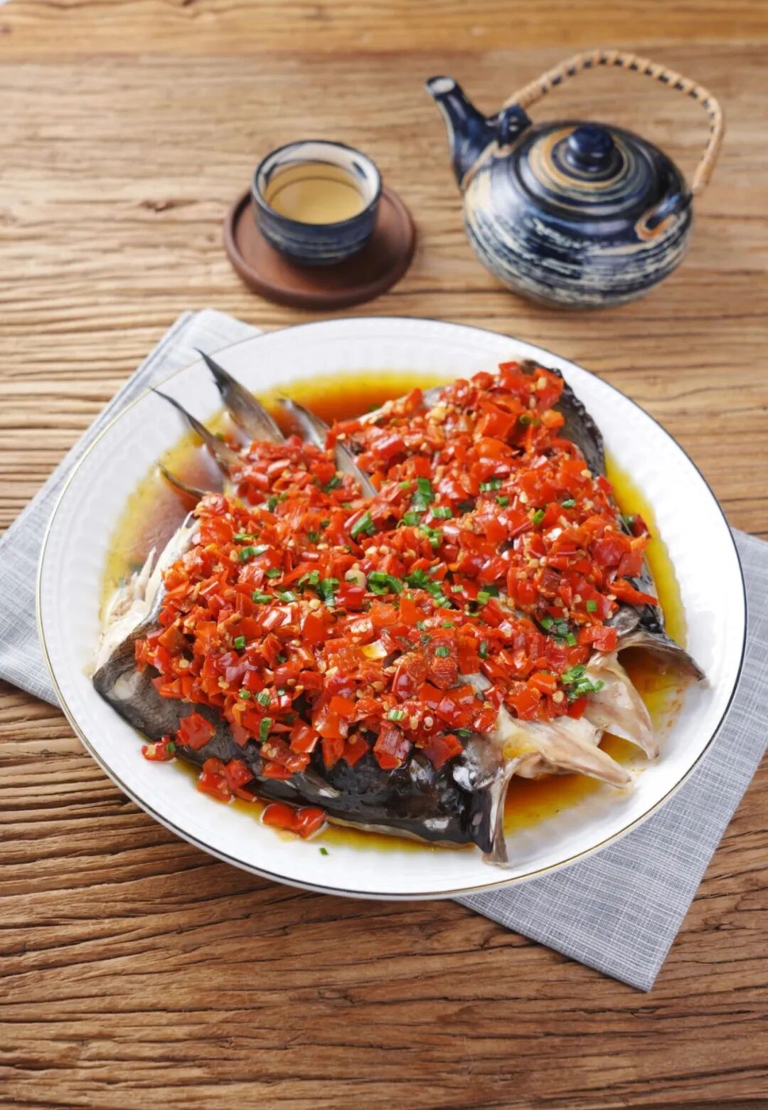 挑一只大鱼,把头斩下,舍弃鱼身,只留下头部,葱姜去腥,铺上满满一层剁椒上锅蒸熟。这时的鱼头基本上已经没有了腥气,只有猛烈的辣和鱼头的鲜,但这还没完,要是想有更强的冲击力,还得需要最后的神器——一勺热菜籽油,热油先与那一层厚厚的剁椒接触,猛的一下剁椒香四散,同时流进鱼头中,这样一条剁椒鱼头才算是完美。