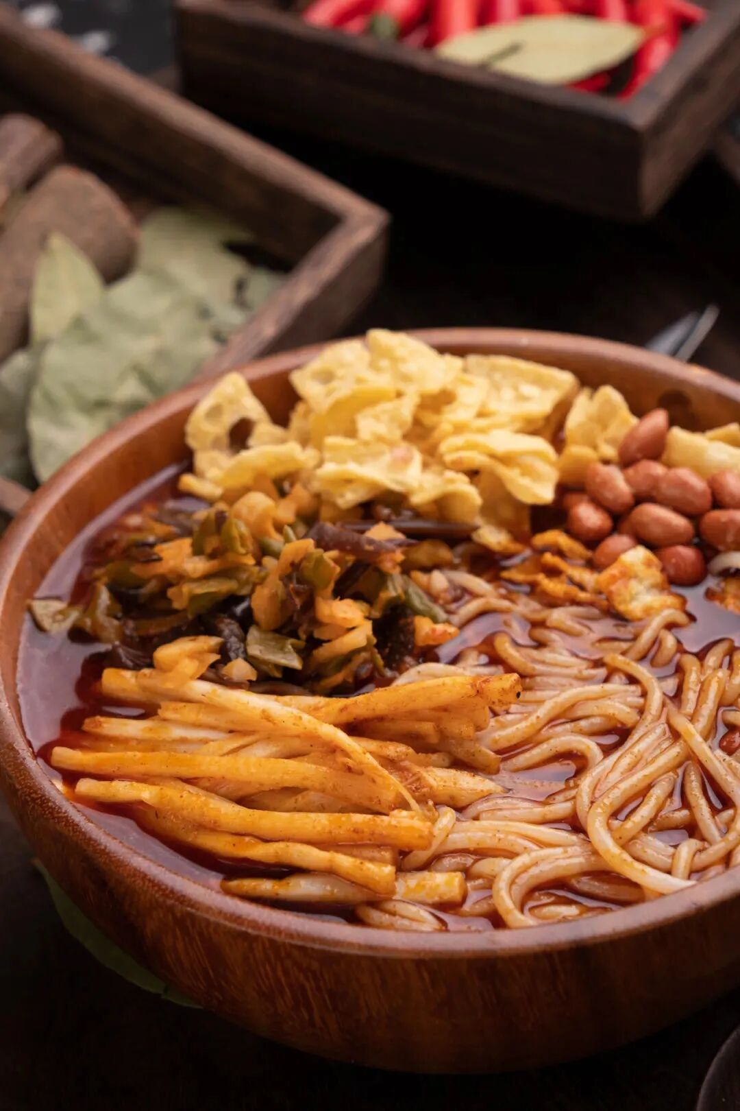 广西的的重口味臭辣代表是螺狮粉,人人都说一碗好的螺蛳粉要够臭,我却觉得是要更香。一味吃酸笋的臭味会让人感到厌倦,但加上辣油就不一样了,臭味是底蕴,辣味是点缀,二者相融合,才是地道的螺狮粉。