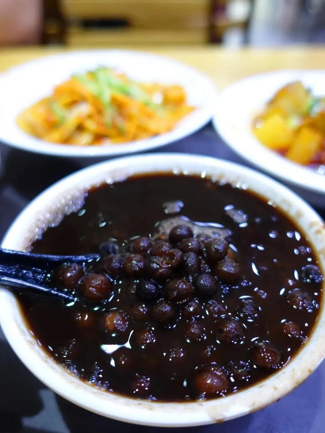 “灰”与“豆”文火熬煮,出锅后“浓汤包裹的灰豆微微发亮如同黑色珍珠”,混着枣味的豆香。这碗看上去“酷酷的”灰豆子吃起来口感像紫米粥,却更加绵软香浓。隆冬热吃,炎夏凉吃,不变的是枣香与豆香中飘出的丝丝甜意,“满福得很!”