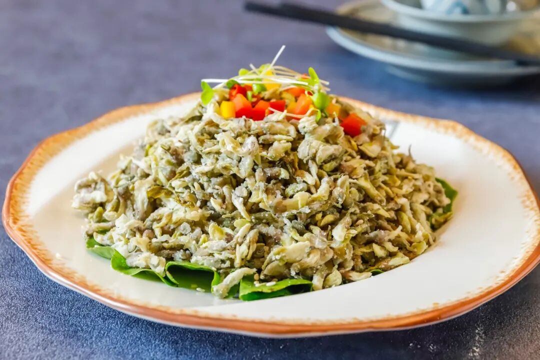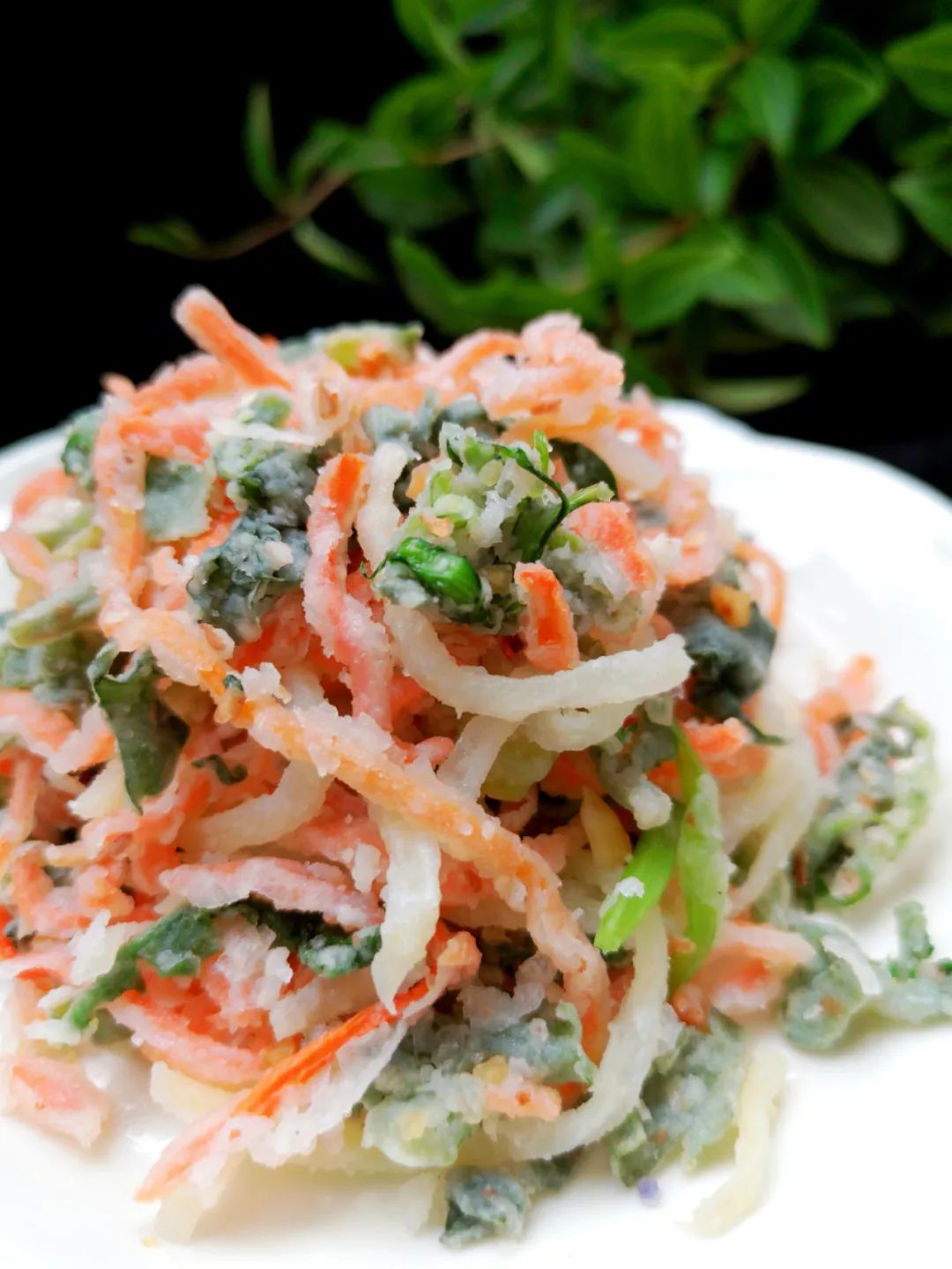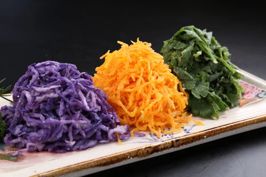 一些地方还专门有“蒸三丝”的传统组合,通常是土豆丝、萝卜丝和红薯丝这三种;如今时髦的餐厅则考虑到色香味俱全,黄色的土豆丝、红色的胡萝卜、紫色的甘蓝丝、绿色的蔬菜叶,在小小的餐盘上蒸出了有趣的小菜岗。