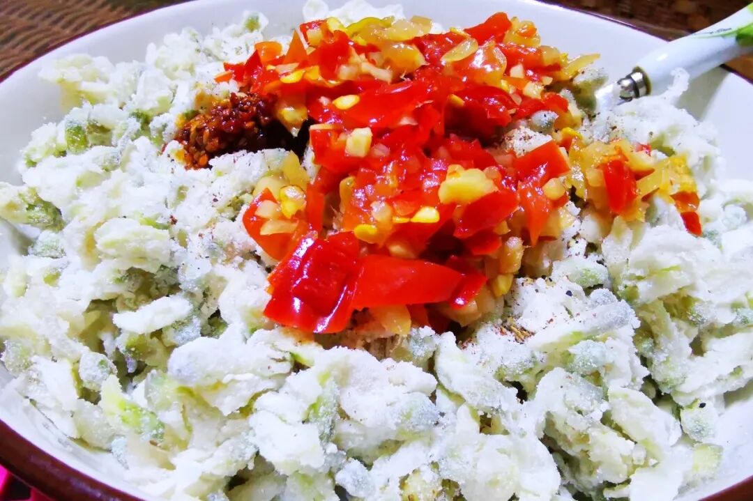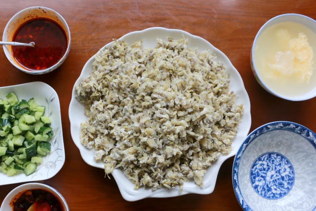 每家每户各有自己偏爱的蔬菜拨烂子,常见蔬菜如土豆、豆角、胡萝卜等,各种野菜叶子、洋槐花也是选择,切成丝或者块,和面粉这么一混合,接下来用蒜泥、生抽和老陈醋调个蘸汁,就能够享用美味的拨烂子。