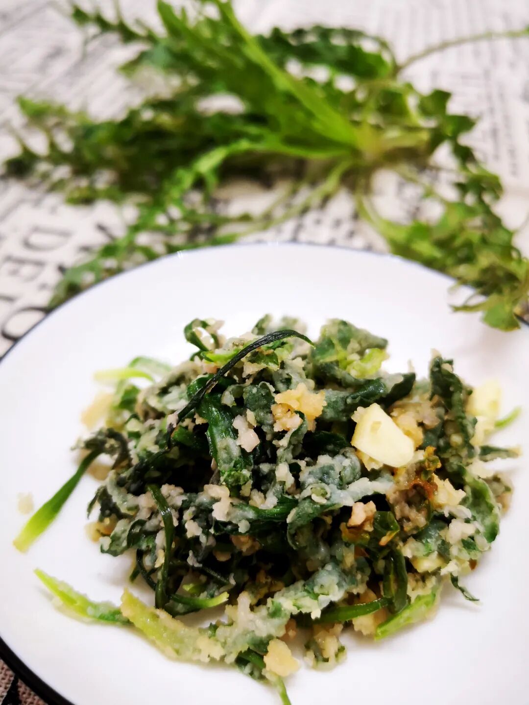接下来先给菜叶子搅好食用油,再分多次、每次少量地加入面粉,用手抓拌开来,直到每一片菜的表面都像裹上了白色霜花一般。之后上锅蒸制,火候到了立即出锅,记得用筷子挑散,能防止热气焖成水沾回菜上影响口感。