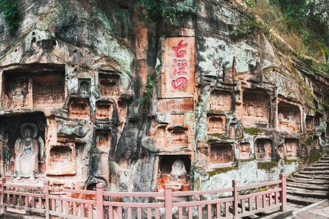 ▲ 上图 东风堰千佛岩景区古建筑群;下图 景区内的摩崖石刻。摄影/仙人板板 图/图虫·创意